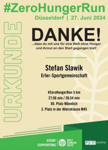 So absolvierte Stefan Slawik den #ZeroHungerRun in Düsseldorf . Am 27.06.2024 startete der 5km Spendenlauf im Rahmen der Welthungerhilfe im Oberbilker Volksgarten. Der Lauf, so schreibt Stefan,