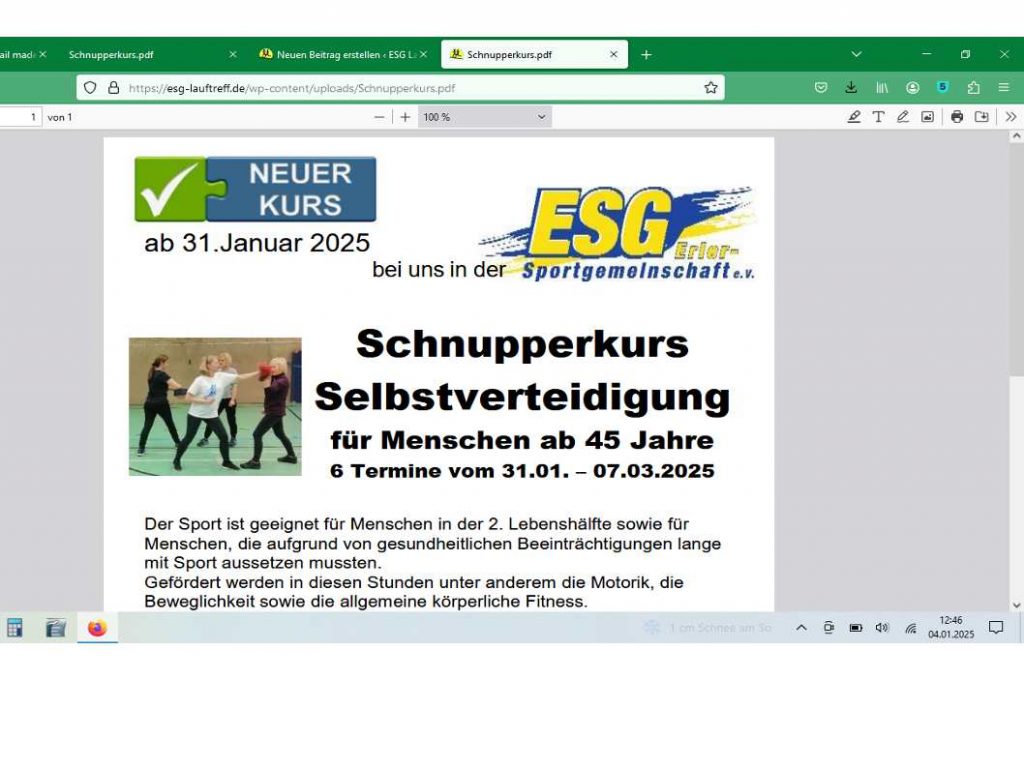 Hallo Erler*innen zum Jahresbeginn bietet die ESG einen Schupperkurs Selbstverteidigung an. Wer Lust hat Näheres unter Schnupperkurs Viel Spaß 4.1.2025 Thomas S.