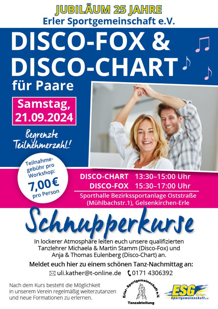 Hallo Erler Die Tanzabteilung bietet im Rahmen unserer 25 Jahr Feier am Samstag, den 21.09., einen Schnupperkurs Disko Fox an. Da wir Läufer und Walker flinke Beine haben ;), ist das ggf etwas für euch. 16.08.2024 Thomas S.
