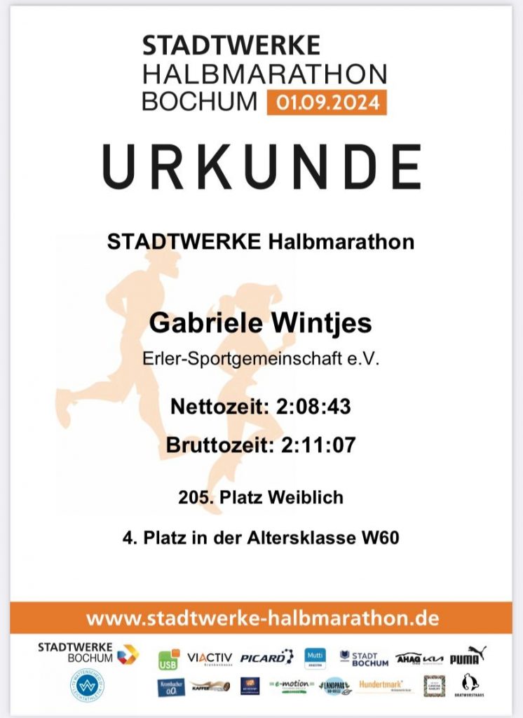 Hallo Erler*innen am letzten Sonntag lief Gabi den Stadtwerke Halbmarathon in Bochum. Mit einer tollen Zeit von 2:08 lief sie die 2 1/2 Runden rund um das „Bermuda Dreieck“. Dies versprach, so bestätigte Gabi, beste Stimmung bei den Zuschauern. Mit dem 4.Platz in ihrer Altersklasse verpasste Gabi zwar knapp das Treppchen, aber vom Spaßfaktor bekommt […]